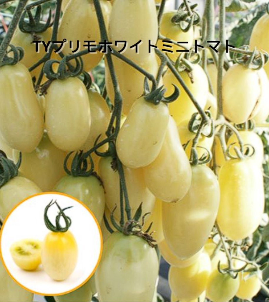 李子形櫻桃番茄品種,果皮白色(淺黄色)、含糖量10°Brix左右,酸度低,非常美味。
